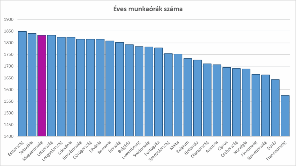 Az Eurofound 2024-es jelentése szerint a magyar munkavállalók évente átlagosan 1 832 órát dolgoznak, ezzel az észt (1 848) és a szlovák (1 840) dolgozók után a harmadik legtöbbet az Európai Unióban.