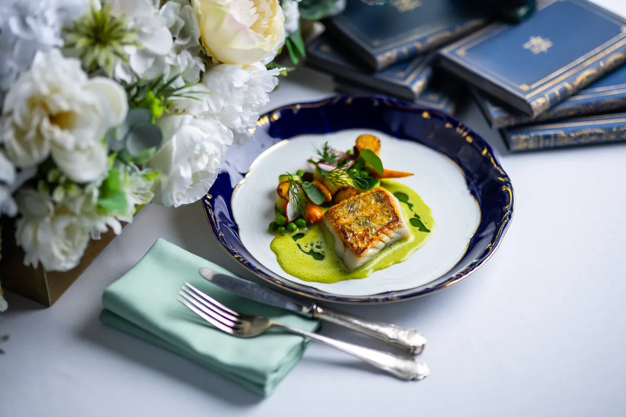 A zöldséglevesben a kömény csak finoman, háttéraromaként jelent meg, a tetején két szem fürjtojással. Visszafogott fűszerezés, letisztult ízek. A főétel, a „Gundel módra” készült sült fogas eredetileg spenóttal érkezett volna, ám a pannonhalmi bencések annak idején határozottan jelezték: köszönik, nem kérnek belőle. Így született meg a borsópürével és grillezett zöldségekkel tálalt változat.