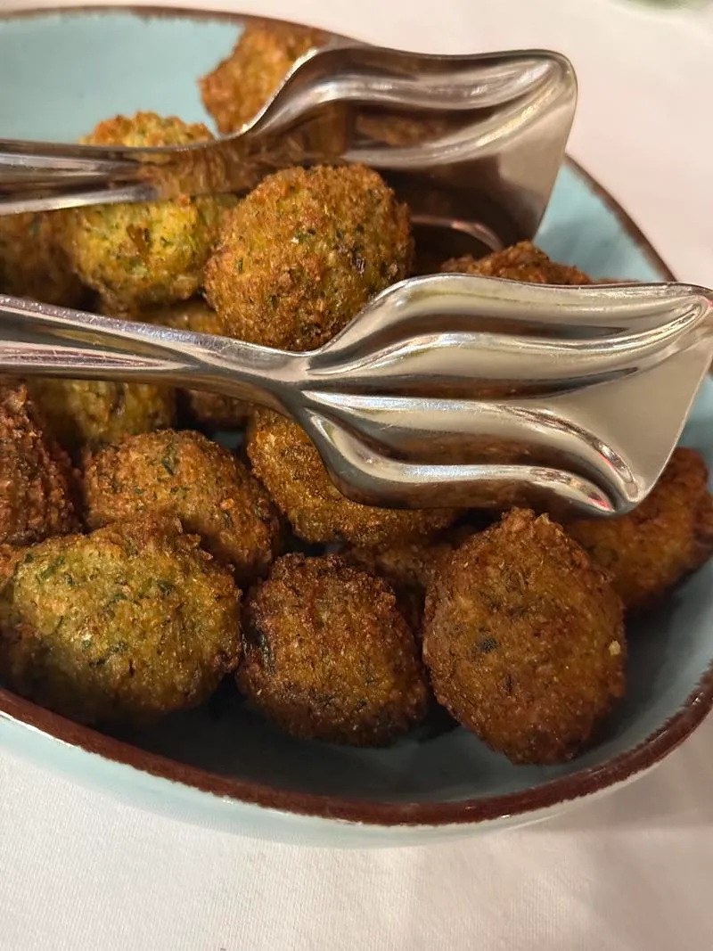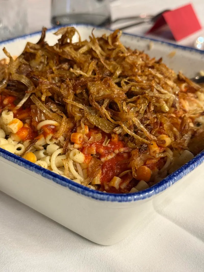 A főételek sorában kiemelkedett a kushari Abu Tarek módra – Egyiptom legismertebb népi étele, amely tésztából, lencséből, ízes paradicsomszószból és ropogósra sült hagymából áll. Ez az egyszerű alapanyagokból készülő, mégis összetett ízű étel az egyiptomiak válasza a street foodra. A grillezett kofta húsnyárs, az eredeti fava babból készült falafel, a fűszeres alexandriai marhamáj (kibda), a luxori stílusú padlizsános rakott (muszaka) és a zöld molokheya – az egyiptomi comfort food par excellence – mind-mind egy-egy ízutazást jelentett. A fűszeres rizs, bár köretként szerepelt a menüben, szinte főétel gazdagságú volt a különböző magvakkal és mazsolával.
